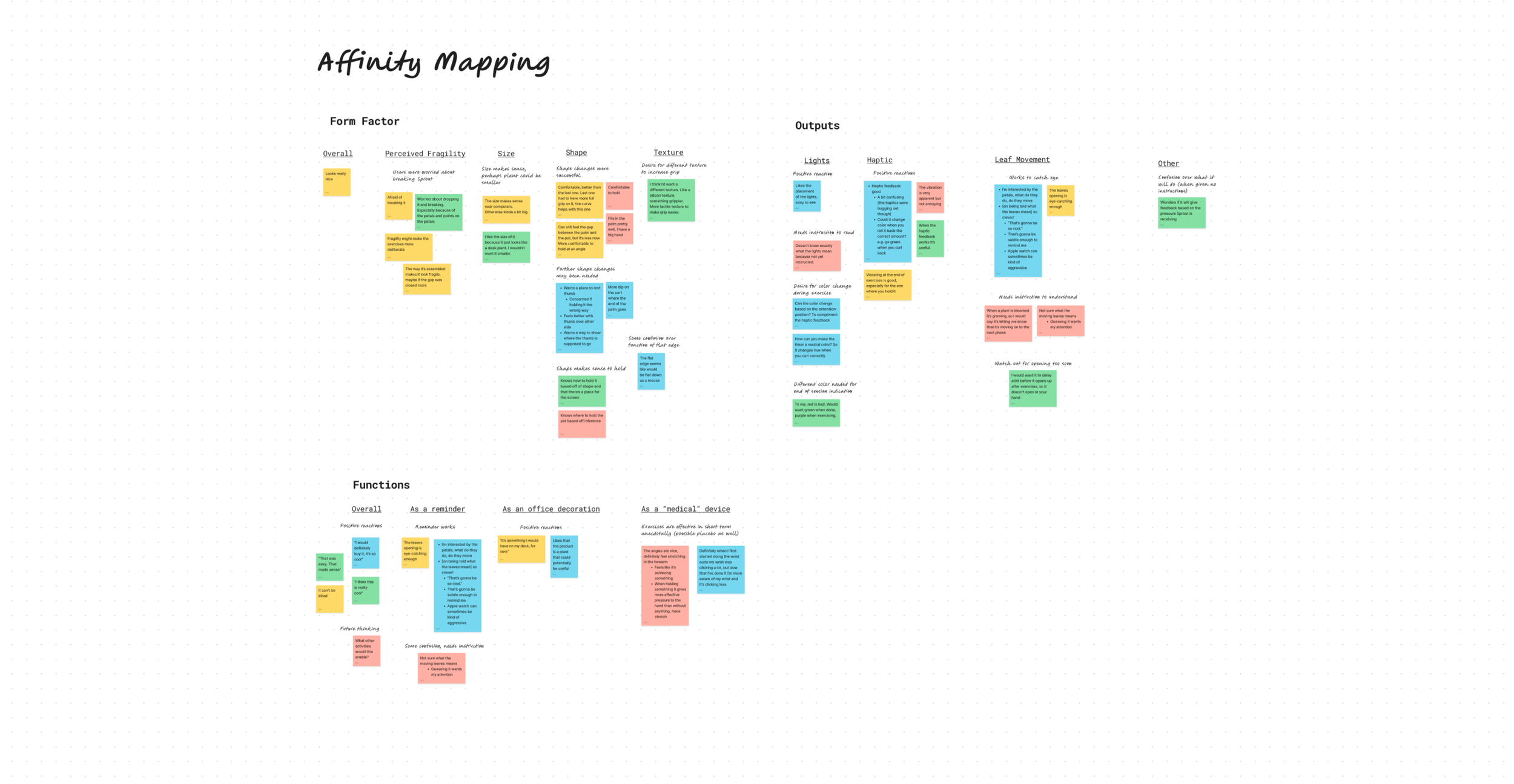 Affinity map of the first round of user testing. Findings included feedback on the shape of the pot, the efficacy of the lights, and its overall function as an exercise reminder